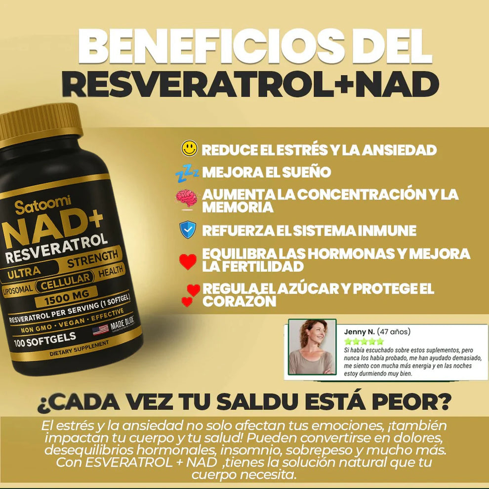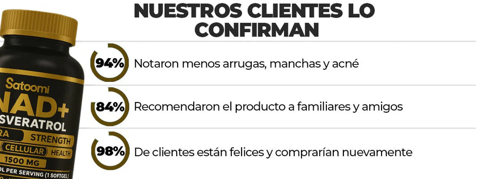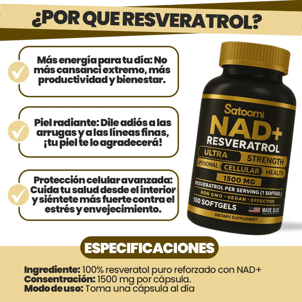 Para la versión Satoomi NAD+ con Resveratrol Ultra Strength 1500 mg (100 softgels), la dosis recomendada es 1 softgel al día con alimentos.